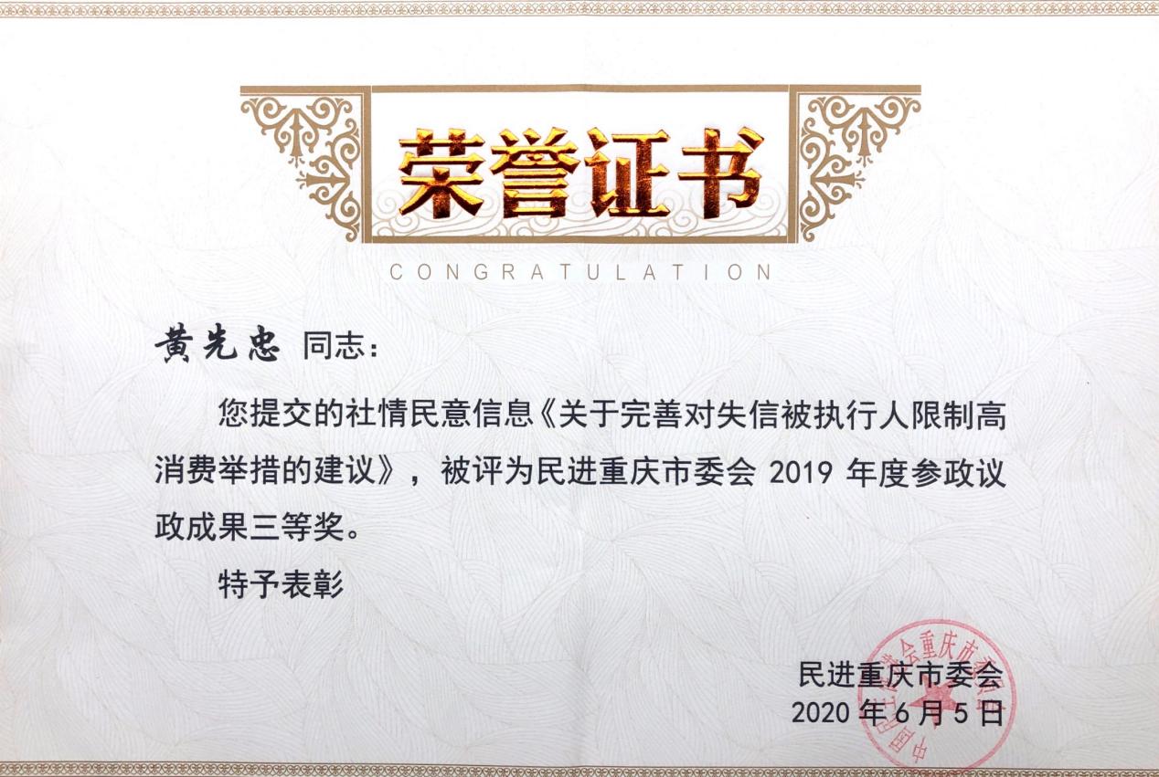 2020年6月5日,我所执行合伙人黄先忠律师提交的社情民意信息《关于完善对失信被执行人限制高消费举措的建议》,被评为民进重庆市委会2019年度参政议政成果三等奖。