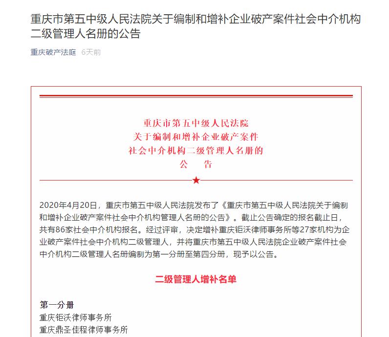 2020年4月20日,重庆市第五中级人民法院发布了《重庆市第五中级人民法院关于编制和增补企业破产案件社会中介机构管理人名册的公告》,共有86家社会中介机构报名。经过近两个月的激烈角逐,市五中院于2020年6月12日发布决定增补27家机构为企业破产案件社会中介机构二级管理人名册的公告,鼎圣佳程所以全市排名第二的优异成绩成功入选该名册!