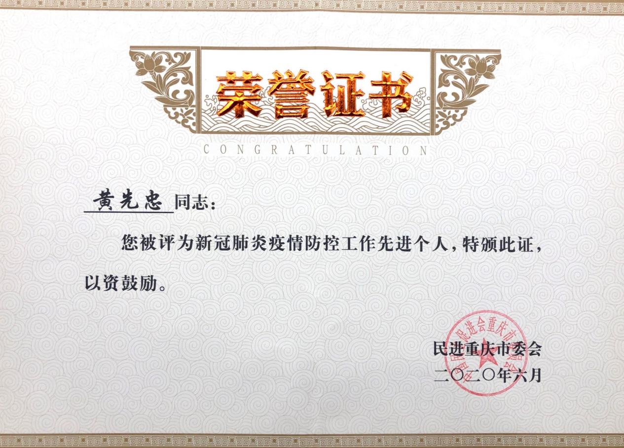 2020年6月,我所执行合伙人黄先忠律师被民进重庆市委会评为新冠肺炎疫情防控工作先进个人。