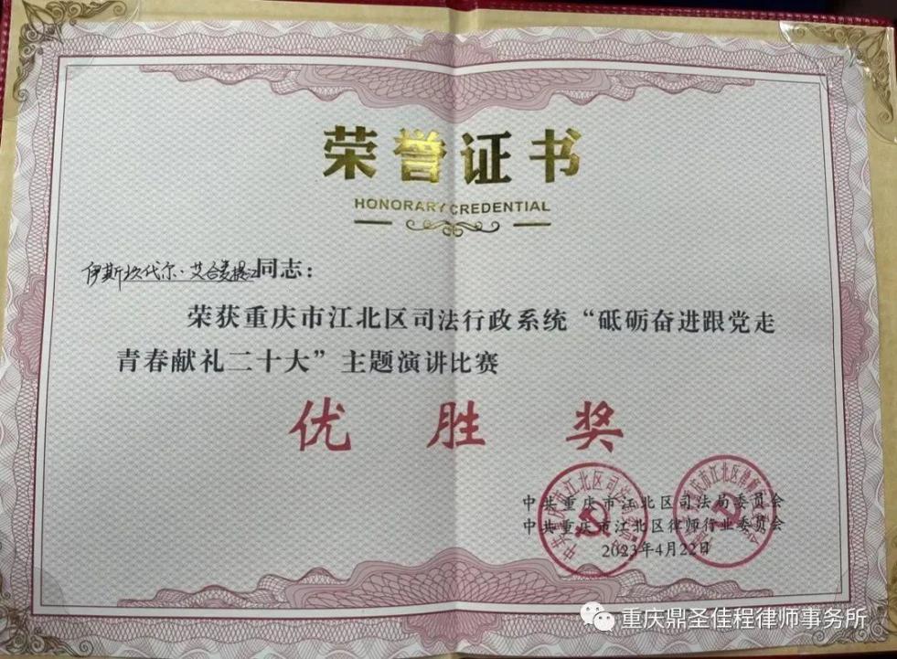 4月22日,江北区司法局举办了“砥砺奋进跟党走 青春献礼二十大”主题演讲比赛,我所伊斯坎代尔·艾合麦提江律师荣获优胜奖。主题演讲比赛结束后,江北区司法局公布了“喜迎二十大·奋进新征程”主题征文比赛获奖人员名单,我所孔雅丽律师荣获一等奖,田景杰律师荣获三等奖。
