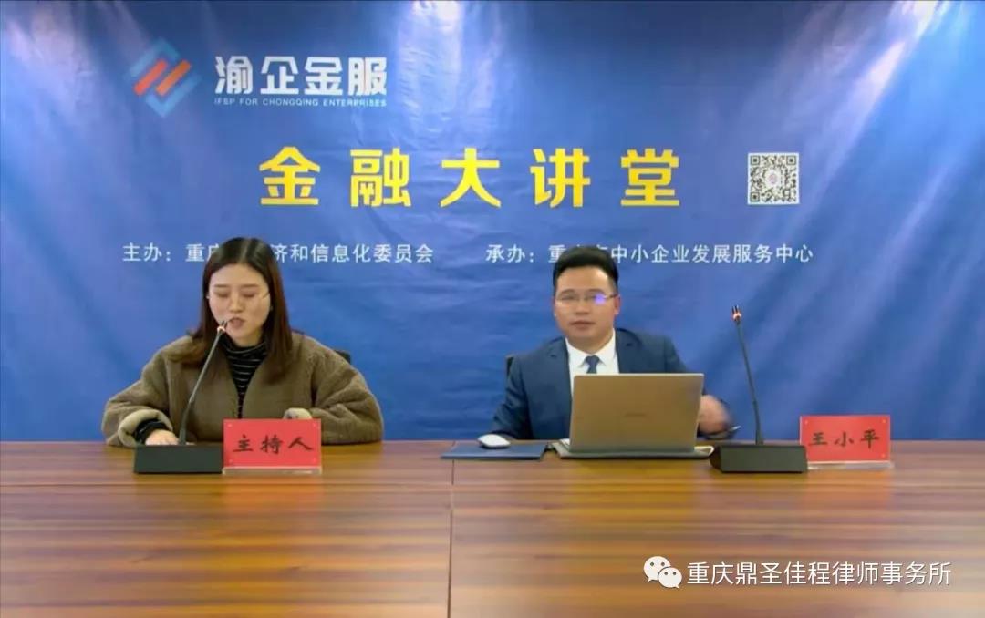 此值第七个国家宪法日,本所管理合伙人、监事会主席、“渝企金服”专家团成员王小平律师受重庆市经济和信息化委员会的邀请,在重庆市中小企业发展服务中心作了《民法典时代对中小企业融资之影响》的主题分享。“渝企金服”金融大讲堂系由重庆市经济和信息化委员会主办,重庆市中小企业发展服务中心承办,向各区县经信委、各企业等机构全程网络直播。![]()