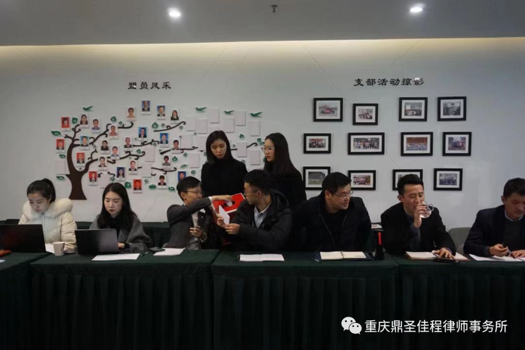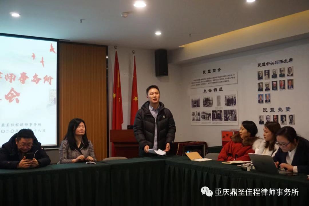 2020年12月18日下午3:00,重庆鼎圣佳程律师事务所第一次全体团员大会在律所大会议室顺利召开。律所全体团员同志参与会议,律所管委会主任蒋文斌同志,律所管委会副主任高燕同志,律所党支部书记蒲东明同志以及其他部分党支部同志莅临会议、指导工作。本次会议由肖畅同志担任主持人。![]() 会议开始前,蒋文斌同志发表讲话,鼓励年轻团员同志积极参与团组织活动,努力提高自身综合素养,为律所团支部的建设与发展添砖加瓦。高燕同志也向团员们分享了工作经验,表达了对团支部未来工作开展的期许。 ![]() (会议在热烈的掌声中正式召开)