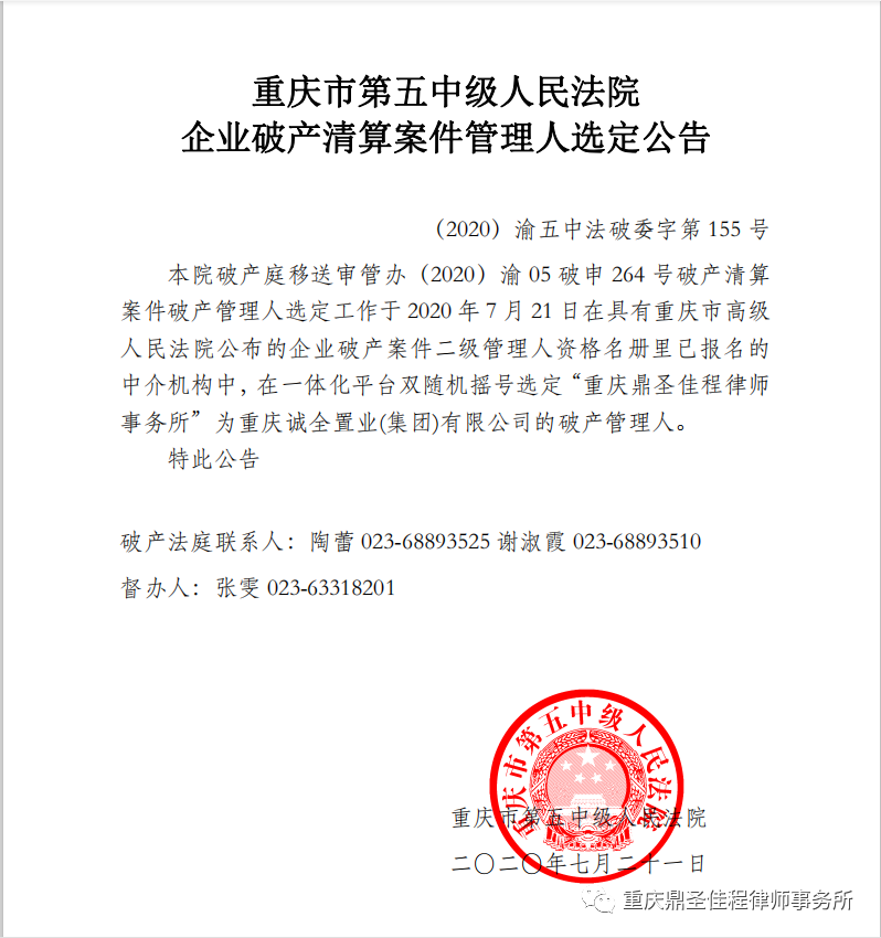 2020年7月21日,重庆市第五中级人民法院发布了企业破产清算案件管理人选定公告,我所被选定为重庆诚全置业(集团)有限公司的破产管理人!