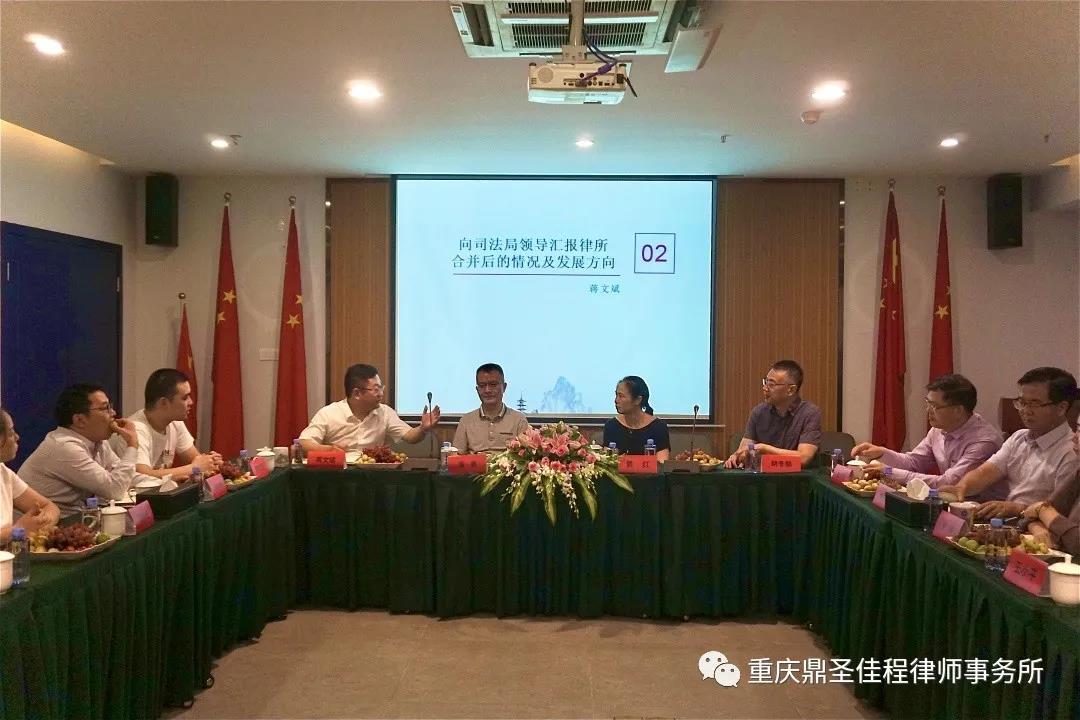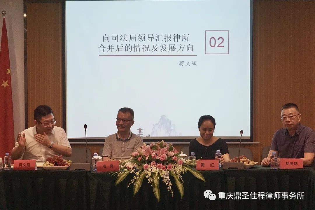 8月11日,重庆市司法局黄红、江北区司法局科长潘勇、党支部书记胡智国及周晓燕一行到访我所参观交流。我所负责人胡冬舫主任携管委会成员与司法局领导针对鼎圣佳程合并后的各项工作进行了一次交流沟通。