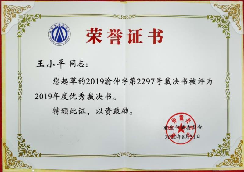 9月4日,重庆仲裁委员会召开了2020年度仲裁员工作暨专题培训会,会上对2019年度优秀裁决书获得者进行了表彰。我所合伙人、监事会主席王小平律师起草的(2019)渝仲字第2297号裁决书被评为2019年度十佳优秀裁决书! 王小平律师于2018年8月19日受聘为第五届重庆仲裁委员会仲裁员以来,勤于钻研,不断提升自己的专业水平;恪守职业道德和执业纪律,公正、高效审理案件。担任独任仲裁员、首席仲裁员审理建筑房地产合同纠纷20余件。本次荣获2019年度十佳优秀裁决书,是对王小平律师深厚的法学理论功底与较强的实践运用能力的肯定。