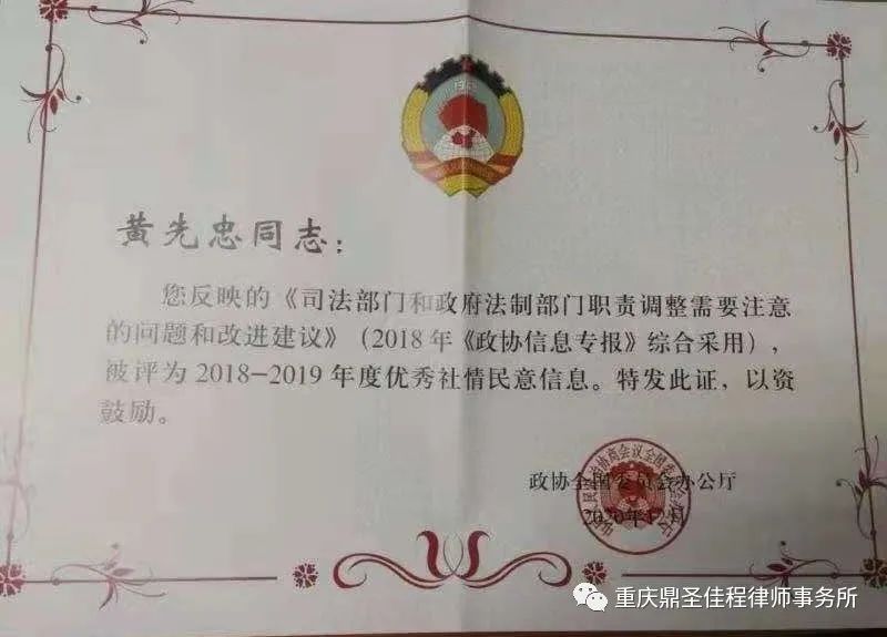 我所管理合伙人黄先忠、王小平分别就我国司法行政部门和政法制度部门职责调整撰写了建议,均得到全国政协采用,并被全国政协评为2018-2019年度优秀社情民意信息。