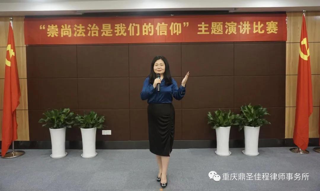 比赛开始前,我所主管培训宣传的管委会副主任高燕简要回顾了中国共产党的成立和发展、中国律师制度的恢复重建和律师队伍的发展壮大以及“依法治国”方略入宪和写入中国共产党党章的历史进程,高度颂扬了中国共产党领导中国人民所取得的伟大成就,将“依法治国”与律师行业的发展和律师事务所的发展目标相结合,以中英双语的方式致了开场词。