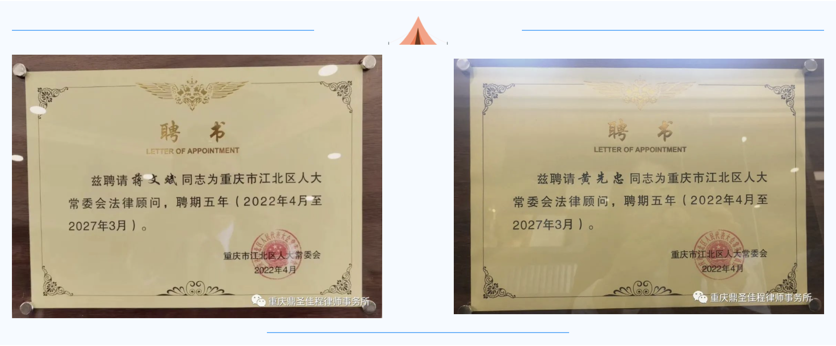 4月21日,重庆市江北区人大常委会法律顾问聘任仪式在江北区人大常委会会议室举行。会议由江北区人大常委会办公室主任朱才虎主持,江北区人大常委会副主任张勇,区人大监察法制委主任委员、办公室主任代晨树等出席了会议。我所管委会主任蒋文斌、管委会副主任黄先忠作为受聘法律顾问参加了本次仪式。