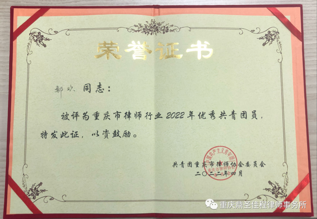 鼎圣佳程简讯|我所鄢欢律师荣获“重庆市律师行业2022年优秀共青团员”称号