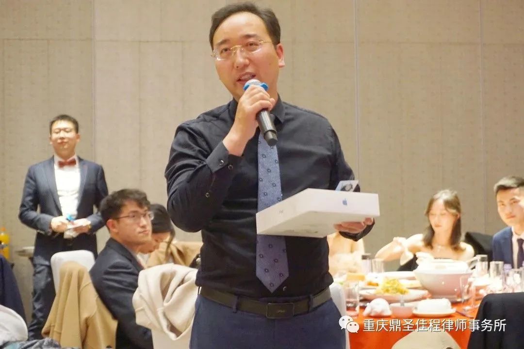 本次年会以“凝心聚力 笃志前行”为主题。年会伊始,胡冬舫主任上台致辞。胡主任首先对江北区司法局律工科科长、江北区律工委秘书长潘勇和江北区司法局律工科主任科员黄鑫的到来表示热烈的欢迎和衷心的感谢。胡主任提到,重庆鼎圣佳程律师事务所目前有132人,执业律师和实习律师有112人。去年,我所总创收达4200多万,合伙人人均创收达116万,在很多律所及企业经济下滑的情况下,我所却有较大幅度的增长。经过全所律师的共同努力,我们已经在江北嘴金融街3号这块全市最先进、最优秀、最富裕的办公区域牢牢的站稳了脚跟。胡主任指出,我所金融团队、1990团队、破产团队、房地产团队在近几年表现突出,他们为律所的发展做出了巨大贡献。胡主任强调,在成绩面前,我们不要骄傲,一方面要继续充满激情、昂扬向上、努力奋斗,一方面要从容不迫、淡定自信。未来,我所将继续引进优秀的人才,扩大律所规模,预计三年内在海南、长沙、深圳等地创办鼎圣佳程分所;我们将加强学习,从今年开始,律所将逐步选出优秀合伙人及优秀律师去先进国家和地区考察交流,加强与国际间的交流、交往与学习;我们将推出培养年轻人的计划,并且推出有效的、具体的措施和办法,帮助年轻人成长。