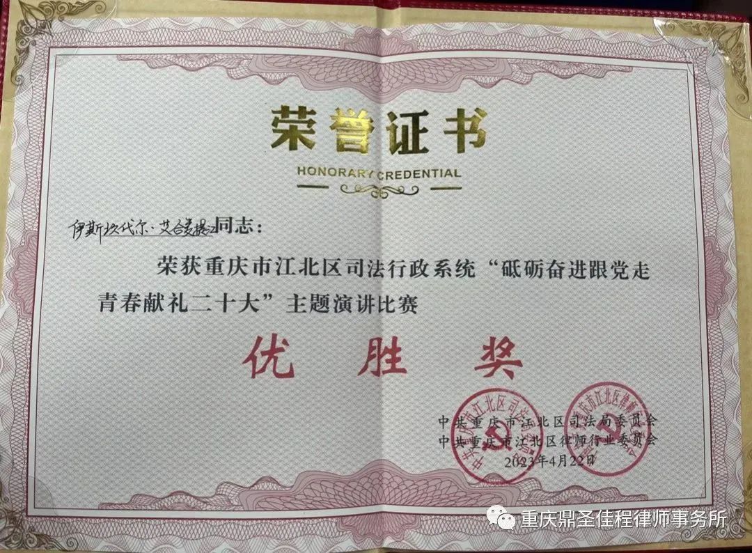 为庆祝党的二十大胜利召开,深入学习宣传贯彻党的二十大精神,激励广大党员在学深悟透中踔厉奋发、毅勇前行,不断引导增强建功新时代的历史使命感和社会责任感,4月22日,江北区司法局举办了“砥砺奋进跟党走 青春献礼二十大”主题演讲比赛,我所伊斯坎代尔·艾合麦提江律师荣获优胜奖。