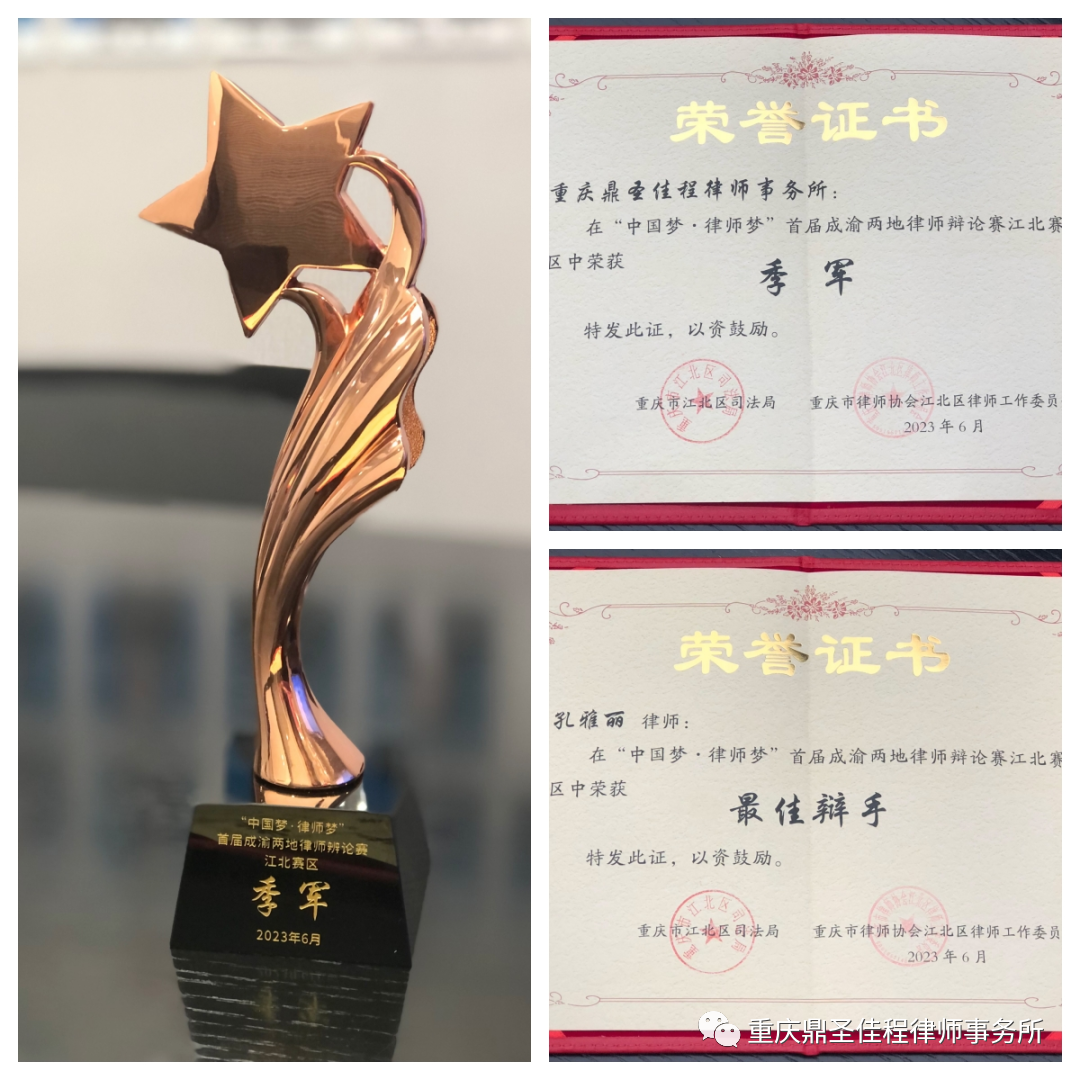 本次辩论赛江北赛区分为初赛、复赛、半决赛、决赛四个阶段进行,前期12支参赛队伍经过激烈比拼,2支律所代表队脱颖而出晋级决赛。决赛现场,组委会为本次参赛队伍的冠、亚、季军以及最佳辩手颁发了奖杯和荣誉证书。我所辩论队荣获“中国梦·律师梦”首届成渝两地律师辩论赛(江北赛区)季军,孔雅丽律师荣获最佳辩手。