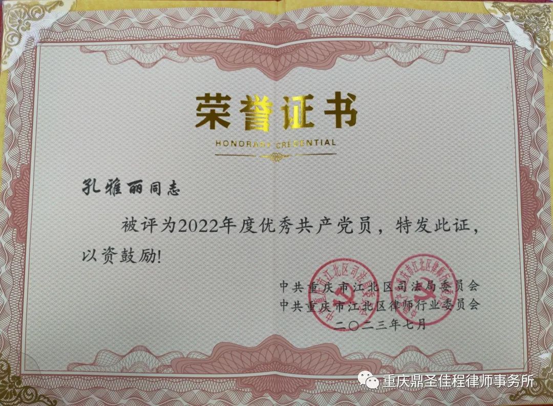 鼎圣佳程简讯|我所孔雅丽律师获评“重庆市江北区律师行业优秀共产党员”