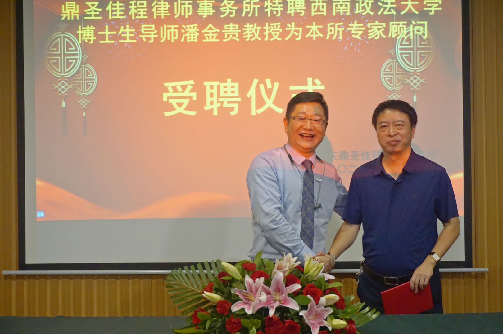 重庆鼎圣佳程律师事务所一直坚持专业化发展道路, 今年初,以管委员副主任蒲东明律师为负责人,我所成立了刑事行政法律事务部。为提升所内刑事案件业务办理水平,经充分洽商,我所有幸邀请到西南政法大学教授、博士生导师、证据法学研究中心主任潘金贵教授出任所内刑事案件特聘专家顾问。9月11日下午14点30分,潘教授受聘仪式在我所大会议室隆重举行,蒋文斌主任代表律所为潘教授颁发了专家顾问聘书。